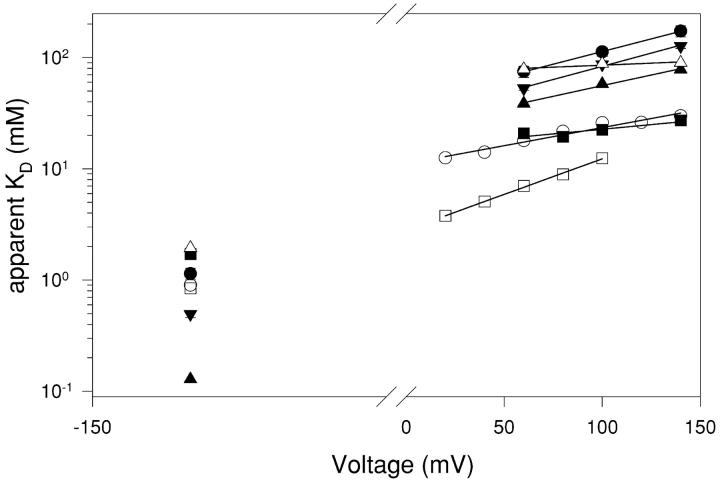 Figure 12. . Apparent KD of the mutants. The apparent KD of the WT (filled circles), S123T (filled squares), T471S (triangles), Y512A (open squares), Y512F (inverted triangles), K519E (diamonds), and K519Q (open circles) is shown as a function of voltage. For clarity only the values at −140 mV and at positive voltages are shown. Solid lines are fits with Eq. 2. Error bars are SEM.