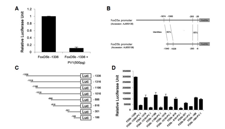 Fig. 3. PV.1 reduces the promoter activity of FoxD5b. (A) Embryos were co-injected with the -1336 construct (20 pg) and PV.1 (500 pg) at the one-cell stage and incubated until stage 10. Luciferase activity was measured as described in the âMaterials and Methodsâ. (B) The graph shows regions of high similarity based upon the NCBI-BLAST results. (C) Schematic representation of the serially truncated FoxD5b promoter constructs. (D) The embryos were injected with FoxD5b promoter alone or with PV.1 as indicated. Luciferase activities were measured at stage 10. The data are shown as the means ± the S.D. of the values from at least three independent experiments. Differences were considered significant at P < 0.05.