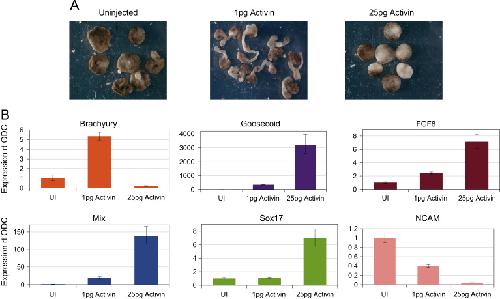 Fig. 2. Mesoderm and anterior mesendoderm induction by Activin in animal cap explants (48 h after animal caps explants are cut from embryo). (A) Axolotl animal caps injected with 1pg Activin mRNA induce mesoderm, and 25pg of Activin induces anterior mesendoderm. (B) qPCR analysis of Brachyury, Mix, Sox17, Goosecoid, FGF8 and NCAM expression in animal caps.