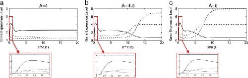 Fig. 6. Numerical solutions of the axolotl in vitro model as functions of A for (a) A=4, (b) A=4.5, (c) A=6. The responses of Brachyury (thin solid line), Mix (dashed line) and Goosecoid (dot-dashed line) are shown. Parameters were chosen as in Table 2.