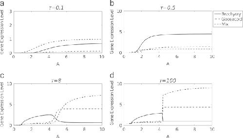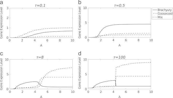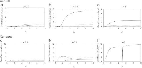 Fig. 7. Numerical solutions of the Xenopus in vitro model (Middleton et al., 2009) and the axolotl in vitro model (7), in the absence of Goosecoid, as functions of A. The responses of Brachyury (thin solid line), Mix (dashed line) and Goosecoid (dot-dashed line) are shown. Parameters used are given in Table 2 for the axolotl model and as given in Middleton et al. (2009) for the Xenopus. Values of λM,G, θG,G and λXM,B are higher in the axolotl model than in the Xenopus model, corresponding to higher rates of production of Mix and Brachyury and a higher threshold for Goosecoid negative autoregulation.