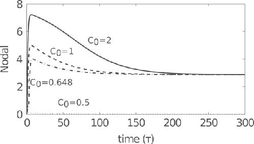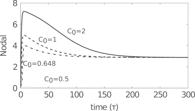 Fig. 8. Numerical solutions to (9) subject to initial conditions (10) with C0 as shown above. For sufficiently large C0, N tends to N⁎, first overshooting this value. Parameters were chosen as in Table 3.