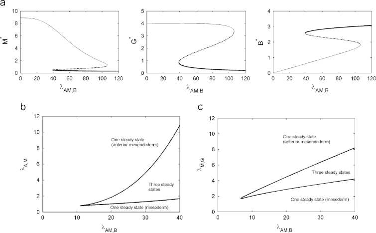 Fig. 4. (a) Steady state solutions to (7) plotted against λAM,B for A=5. Thick solid lines represent the mesoderm steady state, thin solid lines represent the anterior mesendoderm steady state and dashed lines represent the unstable steady state. Fold bifurcations mark the appearance and the disappearance of the steady states. (b) Solution structure in terms of the bifurcation parameters λAM,B and λA,M, these representing the folds that determine the maximum rates of production of Brachyury and Mix in response to activation by Activin. (c) Solution structure in terms of the bifurcation parameters λAM,B and λM,G, these representing the folds that determine the maximum rates of production of Brachyury in response to activation by Activin and Goosecoid in response to Mix. Unless otherwise stated, parameters were chosen as in Table 2.