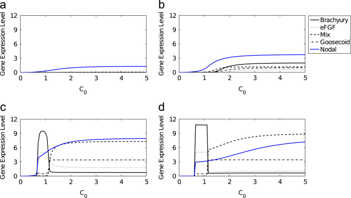 Fig. 9. Numerical solutions of the axolotl model as functions of C0, for various values of Ï. The response of Brachyury (thin solid line), eFGF (dotted line), Mix (dashed line), Goosecoid (dot-dashed line) and Nodal (blue solid line) are shown in response to an initial concentration of β-catenin. Parameters were chosen as in Table 3. (a) T=0.5, (b) T=1, (c) T=8 and (d) T=100. (For interpretation of the references to colour in this figure caption, the reader is referred to the web version of this paper.)
