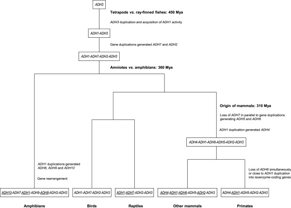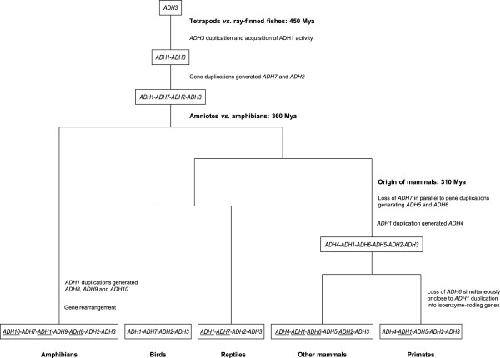 Figure 5. Hypothetical evolutionary pathways leading to tetrapod ADH multiplicity. At the base of vertebrate radiation, an initial tandem duplication of the ancestral ADH3 led to a two-gene cluster. Actinopterygia (ray-finned fish) and sarcopterygia (lobe-finned fish and tetrapods) acquired ADH1 activity by the most 5′ member of the cluster [4]. Before the amniota/amphibian split (360 Mya), ADH2 and ADH7 would have arisen in tetrapods as a consequence of gene duplication events. In reptiles and birds, no additional ADH classes have been found. In contrast, ADH1 tandem duplications led to further class multiplicity in the amphibian lineage; thus, ADH8, ADH9, and more recently ADH10 forms would derive from the ancestral ADH1. Close to the origin of mammals, ADH7 was lost while gene duplications generated ADH5 and ADH6, and tandem duplication of ADH1 gave rise to ADH4. Only in primates, ADH6 was lost simultaneously or close to ADH1 duplications generating ADH1A-C isozymes [13]. Likewise, additional duplications occurred in other vertebrate lineages, and those ADH genes leading to isoenzyme multiplicity in at least one member of that lineage are underlined (in reptiles, multiple ADH1 and ADH7 are found in lizards, but not in turtles). In some organisms, ADH pseudogenes are also observed.