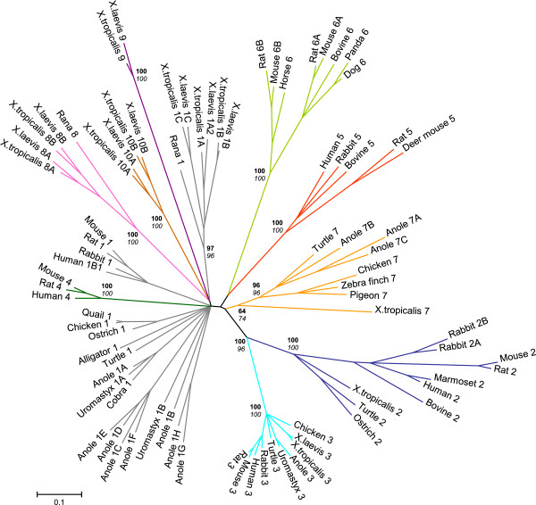 Figure 4. Phylogeny of vertebrate ADHs. Seven amphibian classes of ADH can be differentiated phylogenetically, where branches of each class are shown in a different color. The reliability of the Neighbour-joining (NJ) tree was tested by bootstrap analysis (1000 replicates). Within each class, branches were collapsed when bootstrap values were <80 with the exception of X. tropicalis ADH7. A second tree constructed following the Maximum-likelihood (ML) method (500 replicates) produced a similar topology. Figures at nodes are the scores from bootstrap resampling of the data, NJ values are in bold and ML values in italics. ADH sequences from X. laevis, X. tropicalis, A. carolinensis and P. sinensis are those described in the present manuscript and their accession numbers are provided in Tables 3 and 4. Accession numbers of other ADH sequences are compiled in Table 2. Alignment of all vertebrate ADHs included in the phylogenetic tree is presented in Additional file 15. Scale-bar represents substitutions per nucleotide.