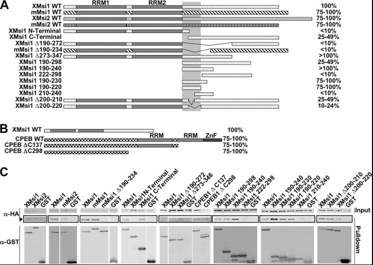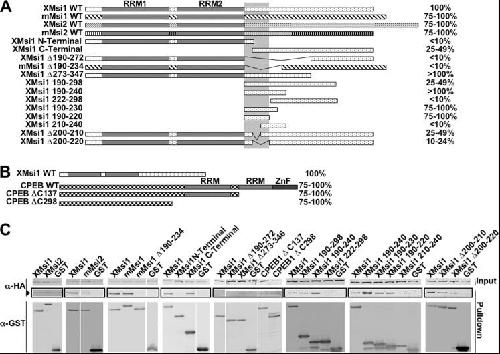 Figure 2. Musashi/GLD2 interaction domain lies within amino acids 190–220 of Musashi. A, oocytes were co-injected with mRNA encoding HA-GLD2 and one of the listed GST-Musashi constructs. Co-injection with HA-GLD2 and the GST moiety alone served as a negative control in all experiments. Following incubation to allow protein expression, the oocytes were lysed and subjected to GST pulldown and RNase I treatment, followed by Western blotting. Horizontal bars schematically represent the Musashi constructs, and % value denotes degree of GLD2 interaction as quantified by spot densitometry and normalized to wild-type Musashi-1 in each case. The vertical bar marks amino acids 190–220, the deduced GLD2 interaction domain. B, mapping of the domain of CPEB1 that associates with GLD2. Methodology was the same as described in A. C, representative experiments from A and B showing GLD2 association (arrowhead) with the indicated Musashi and cytoplasmic polyadenylation element-binding protein constructs. |