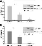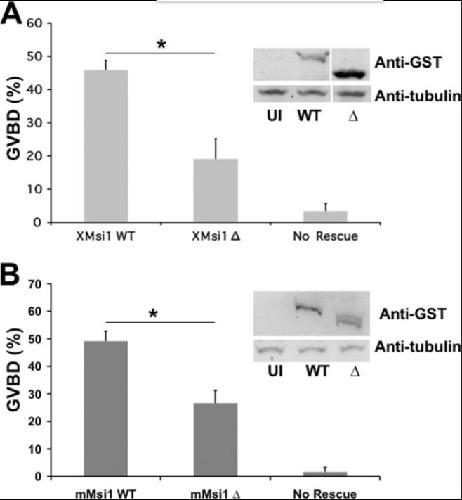 Figure 3. Deletion of the GLD2 binding domain in Musashi-1 compromises Musashi-mediated oocyte maturation. A, oocytes were injected with antisense oligonucleotides targeting endogenous Musashi-1 and Musashi-2. Following incubation, the oocytes were left untreated or re-injected with mRNA encoding wild-type (WT) or deletion mutant Δ190–272 of Xenopus Musashi-1 and allowed to express the protein prior to being stimulated to mature with progesterone. The Δ190–272 Musashi mutant protein is significantly compromised for rescue. The data represent three experiments. The Western panel inset demonstrates expression of the introduced Musashi rescue proteins. UI, uninjected, no rescue protein. * indicates p < 0.05. B, oocytes were injected with antisense oligonucleotides as described in A and subsequently re-injected with WT or Δ190–234 mutant mouse Musashi-1. The deletion mutant protein is significantly compromised for rescue of GVBD. * indicates p < 0.05. |