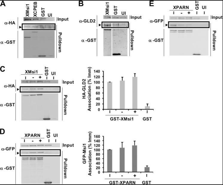 Figure 1. Musashi-1 associates specifically with the noncanonical poly(A) polymerase, GLD2. A, oocytes were co-injected with mRNA encoding HA-GLD2 and either GST-XMsi1, GST-CPEB1, or GST. The injected oocytes were incubated overnight to express the introduced proteins and then lysed. Lysates were then subjected to GST pulldown and treatment with RNase I. Associations were visualized by Western blotting. GST-XMsi1 and GST-CPEB1 associate with HA-GLD2 in an RNase I-independent manner, although the GST tag alone does not (arrowhead). UI, uninjected oocytes. B, oocytes were injected with GST-XMsi1 or GST and allowed to express the protein before lysis and pulldown. An antibody targeting endogenous GLD2 detects GLD2 associating with GST-XMsi1 but not GST (arrowhead). UI, uninjected oocytes. C, oocytes were co-injected with mRNA encoding HA-GLD2 and either GST-XMsi1 or GST. Following incubation, oocytes were stimulated to mature with progesterone. When 50% of oocytes reached GVBD, lysate was made using immature (I) and progesterone-stimulated oocytes pre-GVBD (−) and post-GVBD (+). HA-GLD2 associates with GST-XMsi1 in immature and progesterone-stimulated oocytes (arrowhead). UI, uninjected oocytes. A representative experiment is shown, and the composite results of three independent experiments are shown graphically (right panel). D, oocytes were injected with mRNA encoding GFP-XMsi1 and GST-XPARN or GST. Oocytes were then treated as in C. XMsi1 associates with PARN in immature and progesterone-stimulated oocytes (arrowhead). A representative experiment is shown, and the composite results of three independent experiments are shown graphically (right panel). E, oocytes were injected with mRNA encoding GFP-XCPEB1 and GST-XPARN or GST. Oocytes were then treated as in C and D. As described previously, cytoplasmic polyadenylation element-binding protein dissociates from PARN after progesterone addition. A representative experiment is shown. |