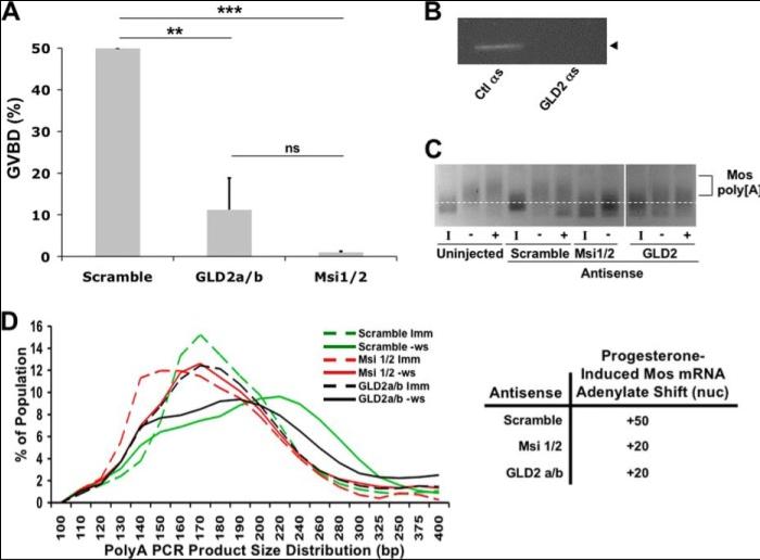 Figure 4. GLD2 is necessary for Musashi-directed polyadenylation. A, oocytes were injected with antisense oligonucleotides targeting either GLD2a/b, Musashi-1/2, or a scrambled control oligonucleotide. Following incubation, the oocytes were stimulated to mature with progesterone treatment. Maturation was scored relative to control antisense-treated oocytes. GLD2 antisense severely attenuates oocytes maturation. The combined data of four independent experiments is shown. **, indicates p < 0.01; ***, indicates p < 0.001. B, representative PCR for endogenous GLD2 mRNA showing loss of intact GLD2 mRNA. C, representative poly(A) length assay for the Musashi target mRNA, Mos. A robust shift in PCR product mobility, indicative of polyadenylation, is seen in both uninjected and control (scrambled oligonucleotide)-injected oocytes. Oocytes injected with GLD2 antisense show dramatically attenuated polyadenylation of the Mos mRNA pool, similar to that seen with Musashi antisense injected oocytes. I, indicates immature oocytes; − indicates progesterone-stimulated pre-GVBD; + indicates progesterone-stimulated post-GVBD. D, graphic representation of the mobility shifts seen in C. The dashed lines are the distribution of MosPCR product in immature oocytes (Imm); solid lines are the distribution of MosPCR products in progesterone-stimulated oocytes pre-GVBD (−ws). The green lines are scrambled-control oligonucleotide-injected oocytes. Red lines represent Msi1/2 antisense-injected oocytes. Black lines are GLD2a/b antisense-injected oocytes. The line peaks indicate the median of the population of mRNA lengths. The shift of the peak between immature (dashed line) and progesterone-stimulated (solid line) indicates the extent of polyadenylation. Scrambled, control oligonucleotide-injected oocytes show a polyadenylation shift of 50 adenylate residues, although both Msi1/2 and GLD2a/b oligonucleotide-injected oocytes show a polyadenylation shift of only 20 adenylates. ns, not significant. |