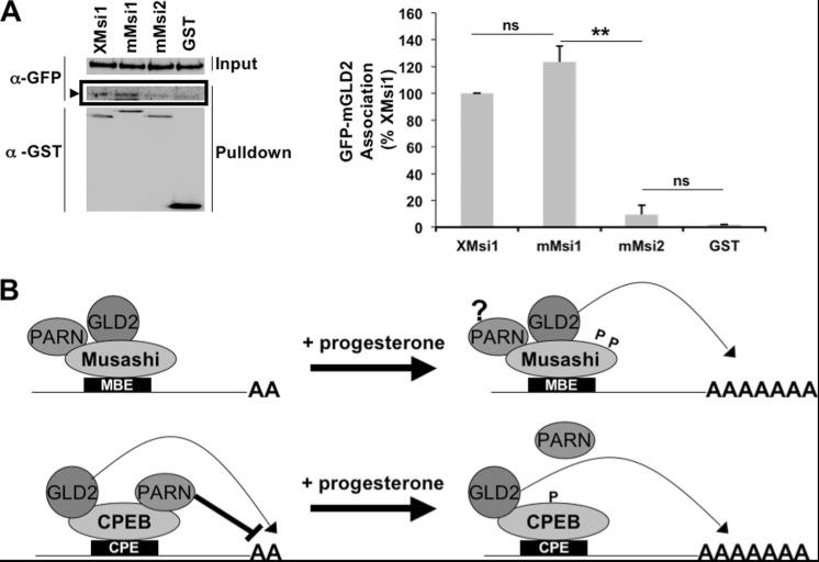Figure 6. Conservation of GLD2 and Musashi-1 co-association. A, oocytes were injected with GFP-tagged murine GLD2 (mGLD2) and GST-tagged Xenopus Musashi-1 (XMsi1), murine Musashi-1 (mMsi1), Musashi-2 (mMsi2), or the GST moiety alone. Co-associated proteins were assessed by Western blotting with GFP. A GFP-mGLD2-specific band was detected in both Xenopus and mouse GST-Musashi-1 pulldowns (arrowhead) but not with GST-mMusashi-2 or GST alone. A representative experiment is shown, as well as the average of three independent experiments (graph, right panel). **, indicates p < 0.01. ns, not significant. B, proposed model of Musashi regulation of polyadenylation of target mRNAs (upper panel). Our data indicate GLD2 mediates polyadenylation of Musashi target mRNAs following progesterone addition. The role and regulation of PARN within the Musashi complex are unclear (?) at the juncture. The cytoplasmic polyadenylation element-binding protein model, showing progesterone-dependent PARN expulsion, is shown for comparison (lower panel). |