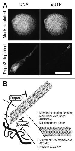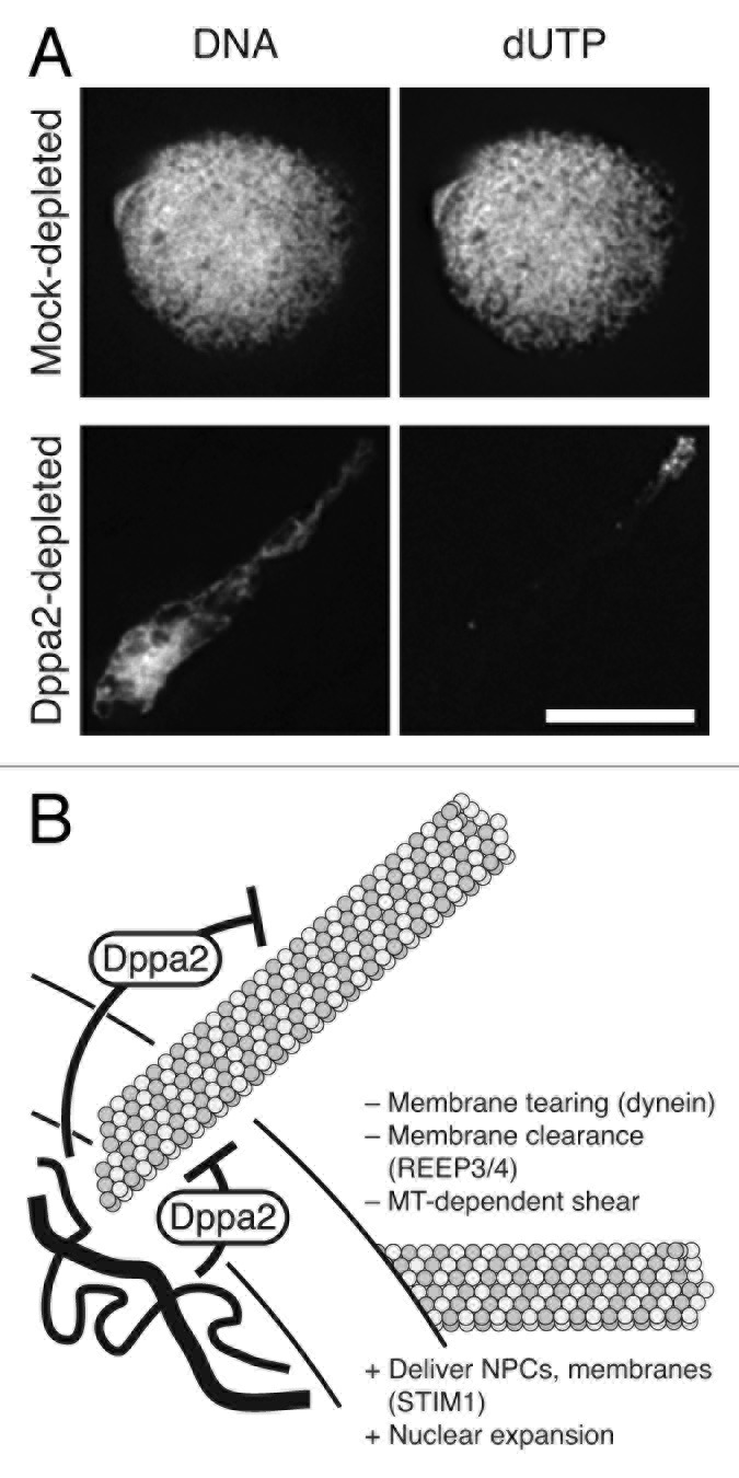 Figure 3. Dppa2 is required for nuclear shape and organized DNA replication. (A) Nuclei assembled in mock depleted and Dppa2-depleted Xenopus egg extracts were fixed at 60 min after release into interphase. DNA was visualized with Hoechst 33342 and replication by incorporation of 1 μM fluorescein labeled dUTP. Scale bar, 10 μm. (B) Chromatin-bound Dppa2 suppresses local microtubule assembly during nuclear formation. Microtubules play both positive (“+”) and negative (“–”) roles on nuclear formation.