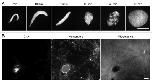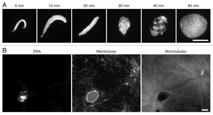 Figure 2. Pronuclear assembly in Xenopus egg extracts. (A) Sperm chromatin was added to metaphase egg extracts, released into interphase and visualized at the indicated time points with 1 μg/ml Hoechst 33342. (B) Fully assembled pronucleus at 60 min. DNA was visualized with Hoechst 33342; nuclear and endoplasmic-reticular membrane with 1 μM CM-DiI lipophilic dye; microtubules with 0.2 μM Alexa-Fluor-488 labeled bovine tubulin. Scale bars, 10 μm.