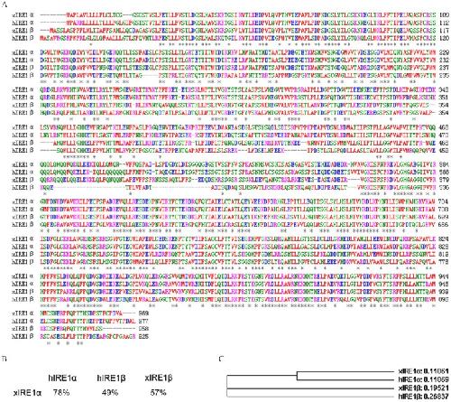 Fig. 1. Xenopus IRE1α sequence analysis.A: Alignment of Xenopus xIRE1α, xIRE1β, hIRE1α and hIRE1β animo acid sequences. Identical residues are marked by asterisks. Gaps are introduced to achieve optimum alignment. B: Percentage of identity between IRE1 proteins. C: Phylogenetic tree of IRE1 proteins of different species created by ClustalW (h, Homo sapiens; x, Xenopus laevis).