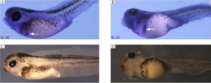 Fig. 2. IRE1α is expressed in the developing pancreas.Whole-mount in situ hybridization data for IRE1α expression at stage 40 (St 40) (A) and 43 (B). The arrows indicate pancreas. C and D are negative control.