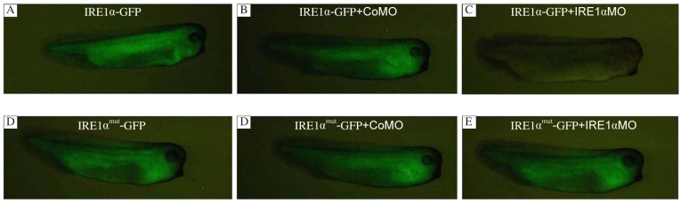 Fig. 3. Inhibition of in vivo translation of a xIRE1α/GFP fusion construct by IRE1α-MO. xIRE1α/GFP RNA or xIRE1αmut/GFP RNA was injected into 4 blastomeres at 4-cell stage alone (A, D), or co-injected with 50 ng control MO (B, E) or 50 ng IRE1α MO (C, F). Embryos were collected at stage 31 and GFP was monitored.