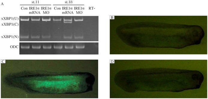 Fig. 6. Effects of xIRE1α on cytoplasmic splicing of xXBP1.RT-PCR (A) detected an increase of cytoplasmic variant xXBP1 (C) in embryos injected with xIRE1α mRNA and a decrease of the xXBP1(C) in embryos injected with IRE1αMO at stage 11 and 18. ODC (ornithine decarboxylase) served as a loading control. Monitoring the xXBP1 splicing by xIRE1α in vivo (B-D). Embryos injected with 500 pg xXBP1(U)-EosFP RNA individually or in combination with 1 ng xIRE1α RNA and/or 50 ng XBP (C) MO. xXBP1 (U), unspliced xXBP1; xXBP1(N), nuclear spliced xXBP1. RT-: no-reverse transcriptase control.