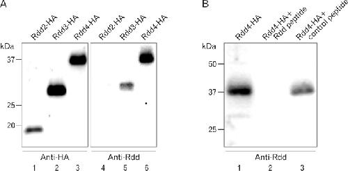Fig. 3. Production of anti-sera against a synthetic peptide from the Rdd3 amino acid sequence. (A) Western blot analysis was performed with anti-HA antibody or anti-Rdd antibody to detect HA-tagged recombinant Rdd proteins. Anti-HA antibody reacted with Rdd2, Rdd3, and Rdd4 proteins (lanes 1-3), while anti-Rdd antibody reacted with Rdd3 and Rdd4 (lanes 5 and 6). (B) Absorption of anti-serum with Rdd (lane2) or control (lane 3) peptide indicated specific reaction of the antibody with Rdd4 protein in Western blot analysis.