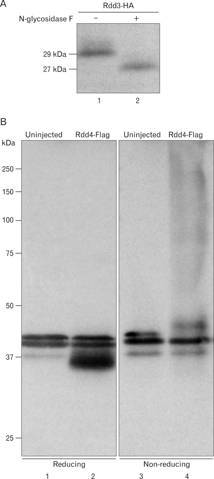 Fig 1. Biochemical properties of Rdd proteins. (A) rdd3-ha mRNA was injected into 2-cell-stage embryos. The embryos were cultured until the late neurula stage. Western blot analysis was performed with extracted proteins after treatment with N-glycosidase F (lane 2) or no treatment (lane 1). The signal of Rdd3-HA was shifted by N-glycosidase F treatment, indicating that recombinant Rdd3 protein was N-glycosylated. (B) Western blot analysis was performed with extracted proteins from uninjected or rdd4-flag mRNA-injected embryos under the reducing (lanes 1 and 2) or non-reducing (lanes 3 and 4) condition. Rdd4-Flag appeared as a single band under the reducing condition (lane 2), but it showed a smear at the high molecular weight range under the non-reducing condition (lane 4).