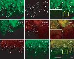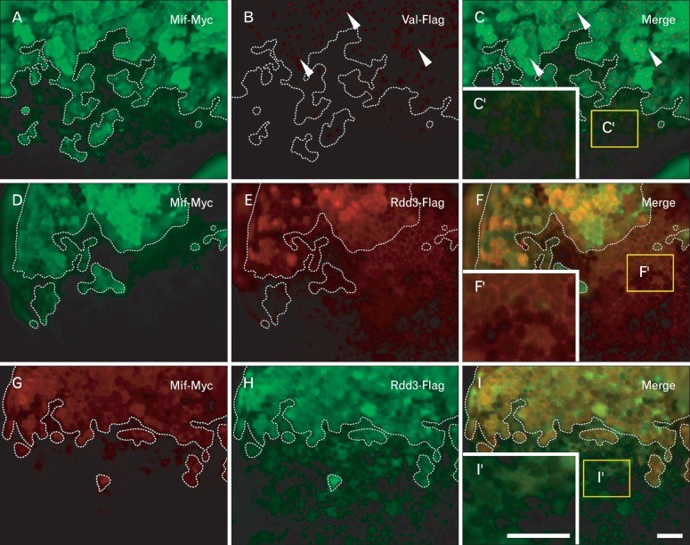 Fig 2. Localization of recombinant Rdd3 protein in the intercellular region. val-flag mRNA (Flag-tagged Val protein) (A-C) or rdd3-flag mRNA (Flag-tagged Rdd3 protein) (D-I) together with mif-myc mRNA (coding for Myc-tagged Mif protein) were injected into a single blastomere at the 16-cell stage. Animal cap explants were isolated and cultured until the early tailbud stage (st. 20). Explants were stained with anti-Myc and anti-Flag antibodies simultaneously and the reaction was visualized with Alexa488-based fluorescence (A, D, H) and Cy3-based fluorescence (B, E, G). Positive signal for Mif protein shows descendant cells of the RNA-injected single cell at the 16-cell stage (A, D, G). The border between the injected and uninjected cells is indicated by a white dotted line. Merged images of the double staining are also shown (C, F, I). Val-Flag protein was detected in the nuclei of cells that had been injected with mif-myc mRNA (C, C'). On the other hand, Rdd3-Flag protein was stained in the cytoplasm of Mif-positive cells and also stained in the intercellular region of Mif-negative cells (F, F'). Exchange of the second antibodies between Cy3-conjugated IgG and Alexa488-conjugated IgG gave the same results (I, I'). Scale bars in panels I and I'=50 µm (A-I), 50 µm (C', F', I').