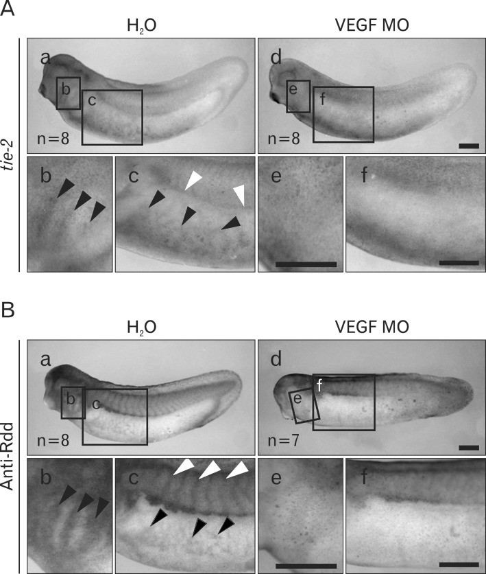Fig 5. Concomitant localization of Rdd3 protein with blood vessel formation. Whole-mount in situ hybridization (A) and whole-mount immunostaining (B) analyses were performed to show tie-2 expression and Rdd protein localization in tailbud (st. 32) embryos. Embryos were injected with vascular endothelial growth factor Morpholino oligo (VEGF MO) (9.2 pmol/embryo) (d-f ) or H2O (a-c) in the marginal zone at the 4-cell stage. (A) In the control embryo, tie-2 was expressed in the vitelline vein (b, arrowheads), intermediate mesoderm (c, white arrowheads) and branchial arches (c, arrowheads). Localization of tie-2 expression was lost in the VEGF MO-injected embryo (d-f ). (B) Rdd protein was detected in the vitelline vein (b, arrowheads), intersomite region (c, white arrowheads), and branchial arches (c, arrowheads). Localization of Rdd protein was lost in the VEGF MO-injected embryo (d-f ). Scale bars=0.5 mm (A, B).