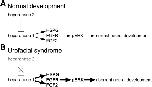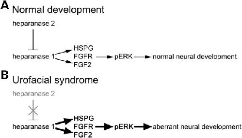Figure 8. Schematic diagram of proposed heparanase 2 function in FGF signalling and motor neuron development. (A) In normal development, heparanase 2 inhibits the activity of heparanase 1, both biochemically by sequestering HSPGs (17) and possibly transcriptionally (this study). This inhibition maintains normal levels of FGF signalling and downstream genes within the embryo, allowing correct motor neuron functional development. (B) Loss of heparanase 2 causes upregulation of FGF signalling (and subsequent deregulation of downstream pathway components), perturbing expression of genes required for motor neuron development. |