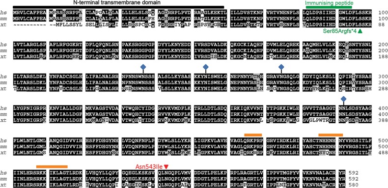Figure 1. Alignment of the Xenopus heparanase 2 protein sequence with human and mouse orthologues. Xenopus heparanase 2 shares 80% identity (black highlight) and 88% similarity (black plus grey highlight) with human heparanase 2. The majority of non-conserved amino acids are in the N-terminal region (black bar), predicted to constitute a signal peptide. Putative HS-binding motifs are indicated by orange bars. Glycosylated amino acids are indicated by blue diamonds. Asn543, which undergoes a missense mutation in UFS (10), is conserved between species. The immunizing peptide used to generate the heparanase 2 antibody used in this study is indicated in green as is the nonsense mutation created by injection of the splice acceptor morpholino (MO1). |