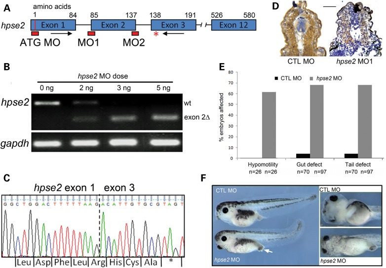 Figure 4. Morpholino knockdown of heparanase 2. (A) Schematic diagram of the X. tropicalis hpse2 gene, showing: exons (blue blocks); ATG MO and splice MO targets (red blocks) at the splice acceptor (MO1) and splice donor (MO2) sites of exon 2; PCR primers flanking exon 2 (black arrows); and the premature stop codon in exon 3 (red asterisk) generated by MO1. (B) Injection of increasing amounts of MO1 induced missplicing of hpse2, with 5 ng abolishing expression of wild-type (wt) hpse2 mRNA in favour of a shorter mRNA (exon 2Î). (C) Sanger sequencing of the shorter PCR product confirmed absence of exon 2 (indicated by dotted vertical line). A novel, in-frame pre-mature stop codon was generated in exon 3 (asterisk). (D) Injection of 5 ng MO1 led to near-complete loss of heparanase 2 neural tube and myotome immunoreactivity, as demonstrated in this Stage 40 embryo; CTL MO on left and MO1 on right. (E) Frequency (%) of the hypomotility, lack of gut looping (gut defect) and tail curvature (tail defect) phenotypes associated with administration of CTL MO or MO1, with total numbers of embryos assessed indicated by ânâ. (F) The upper two images depict CTL MO-administered embryos and the lower two images show effects of MO1. Left-hand section depicts embryos viewed from the side; note the protruding proctodeum (white arrow) and tail curvature in the morphant. The two frames on the right depict the embryos viewed from their ventral aspects; note that gut coiling is present in the control embryo but not in the morphant. |