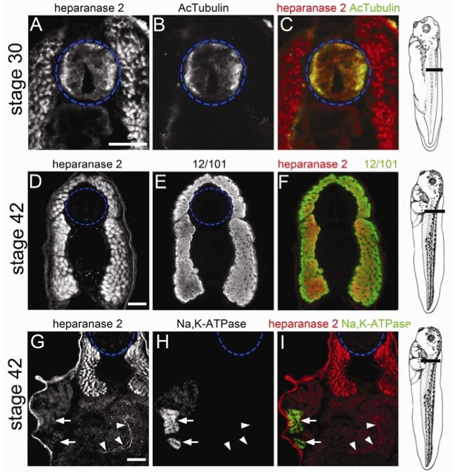 Figure 3. Tissue-specific localization of heparanase 2. Transverse sections through the trunk of Xenopus embryos, as indicated in the diagrams shown on the right, imaged by immunofluorescence, with the neural tube outlined by blue dashed circles. In merged images, heparanase 2 localization is indicated in red while other proteins are indicated in green. (AâC) Heparanase 2 colocalized with acetylated α-tubulin (AcTubulin) in the lateral zones of the Stage 30 neural tube. The flanking myotomes were also positive for heparanase 2. (DâF) At Stage 42, heparanase 2 was absent in the neural tube but myotomes, co-immunostained with the muscle-marker antibody 12/101 (it is the name of an antibody), remained positive. (GâI) The Stage 42 pronephric tubule did not display a specific IHC signal for heparanase 2; note that here, the weak signal is background autofluorescence. The two arrows indicate a proximal tubule which in H and I is seen to be reactive with Na+/K+-ATPase antibody. The set of three arrowheads in (G)â(I) demonstrate specific heparanase 2 immunostaining in the apical zone of epithelia lining the gut lumen. Scale bars are 50 µm. |
