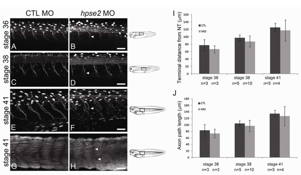 Figure 5. Visualization of motor neurons in parasagittal imaging plane. (A)â(F) whole-mounts immunostained with antibody to acetylated α-tubulin. This labels axons and also multiciliated round organs in the skin, the latter appearing as white ovals. (G) and (H) were probed with the muscle antibody 12/101. (A), (C), (E) and (G) are from CTL MO-administered embryos while (B), (D), (F) and (H) are from MO1-administered embryos. Scale bars are 50 μm. (AâF) Across the top of each frame, a longitudinal section of the neural tube is evident, with the anterior to the left. In morphants, at Stages 36, 38 and 41, neurons which had emanated from the neural tube were regularly spaced but their axons lacked compact bundling and coherent directional extension seen in controls. The irregular topography of certain morphant nerves is indicated by arrowheads in (B), (D) and (F). (G and H) Morphants showed lack of clear separation of skeletal muscle blocks at somitic boundaries (arrowheads in H). (I and J) Nerve lengths (means ± SD), as assessed by determining the shortest distance between where they exited the neural tube and their overt termini (I) or by tracing individual nerves (J). The average length of 4â6 nerves per embryo was used to generate a value for each embryo, with 3â10 embryos in each experimental group, as indicated. |