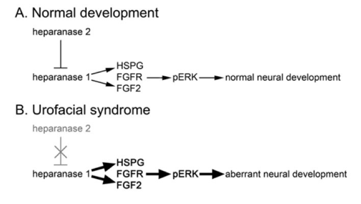 Urofacial syndrome (UFS; previously Ochoa syndrome) is an autosomal recessive disease characterized by incomplete bladder emptying during micturition. This is associated with a dyssynergia in which the urethral walls contract at the same time as the detrusor smooth muscle in the body of the bladder. UFS is also characterized by an abnormal facial expression upon smiling, and bilateral weakness in the distribution of the facial nerve has been reported. Biallelic mutations in HPSE2 occur in UFS. This gene encodes heparanase 2, a protein which inhibits the activity of heparanase. Here, we demonstrate, for the first time, an in vivo developmental role for heparanase 2. We identified the Xenopus orthologue of heparanase 2 and showed that the protein is localized to the embryonic ventrolateral neural tube where motor neurons arise. Morpholino-induced loss of heparanase 2 caused embryonic skeletal muscle paralysis, and morphant motor neurons had aberrant morphology including less linear paths and less compactly-bundled axons than normal. Biochemical analyses demonstrated that loss of heparanase 2 led to upregulation of fibroblast growth factor 2/phosphorylated extracellular signal-related kinase signalling and to alterations in levels of transcripts encoding neural- and muscle-associated molecules. Thus, a key role of heparanase 2 is to buffer growth factor signalling in motor neuron development. These results shed light on the pathogenic mechanisms underpinning the clinical features of UFS and support the contention that congenital peripheral neuropathy is a key feature of this disorder.