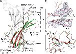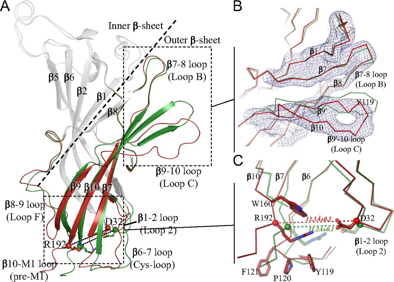 Fig. 2. Tertiary reorganization observed in an ECD monomer. (A) The structural elements that differ between the pH 4 and pH 7 ECD GLIC structures are shown in green for pH 4 and in red for pH 7 GLIC. Other parts of the structures are in gray. Residues Asp32 and Arg192 are shown as sticks. The dashed line delineates the inner and outer β sheets. (B) Enlarged view of the orthosteric agonist binding site illustrating the detachment of loop C from loop B. The blue mesh is the 2mFoâDFc NCS-averaged electron density map contoured at a level of 1.5 Ï. (C) The interface between the ECD and the TMD at the level of the β1âβ2, β6âβ7, and β10âM1 loops. The dashed line indicates the distance between the Cα atoms of Asp32 and Arg192.