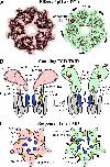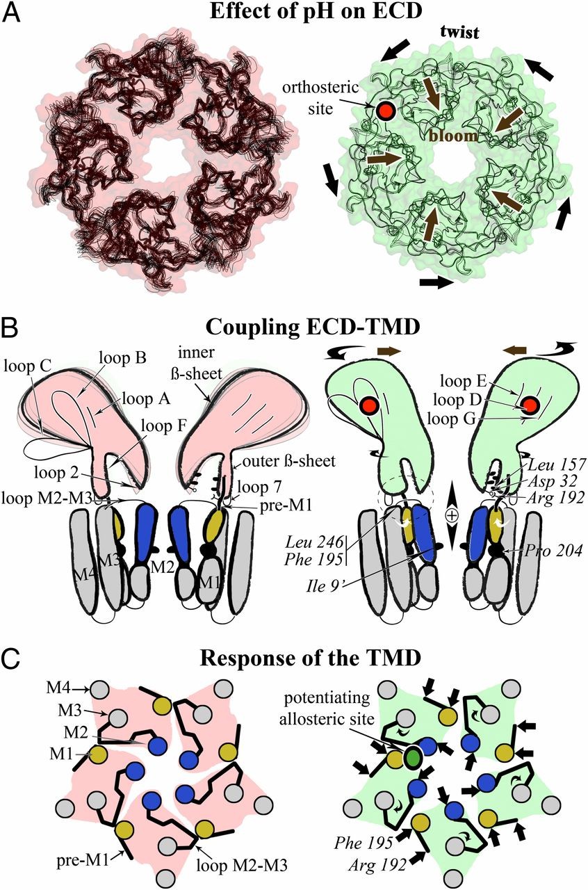 Fig. 4. A sequential model for the activation of pLGICs. (A) The reduced flexibility in the ECD when going from the pH 7 form (Left, pink) to the pH 4 form (Right, green) is illustrated with superimposed atomic models. The quaternary associated twist and bloom motions are indicated with black arrows. The binding site of the agonist is shown in red. (B) Changes of the ECDâTMD interface in both states are shown in a schematic way. Residues shown experimentally to be involved in these interactions are indicated. The top of M2 helix is in blue, and the N terminus of M1 is in yellow. (C) Schematic view from the top and down the C5 axis of the TMD conformation in both states. The binding site for a positive modulator (anesthetics) is shown in green.