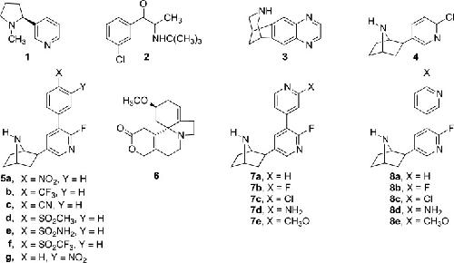 Synthesis, nicotinic acetylcholine receptor binding, and antinociceptive properties of 2'-fluoro-3'-(substituted phenyl)deschloroepibatidine analogues. Novel nicotinic antagonist.