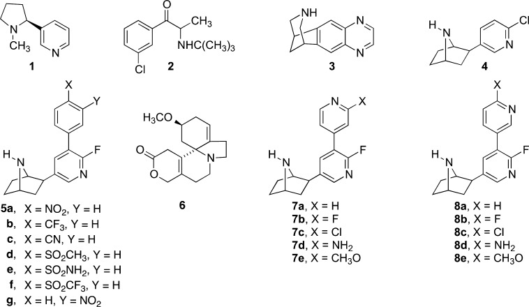 2-Fluoro-3-(4-nitro-phenyl)deschloroepibatidine is a novel potent competitive antagonist of human neuronal alpha4beta2 nAChRs.
