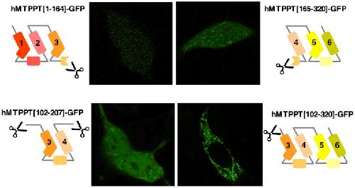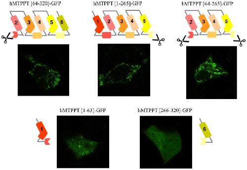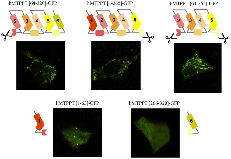 Figure 4. Systematic truncation of the hMTPPT polypeptide and their expression pattern in HepG2 cells.Sub cellular expression of indicated (five) hMTPPT-GFP truncated constructs in HepG2 cells. Lateral (xy) confocal images of different truncated constructs were imaged after 24–48 hrs of transient transfection.