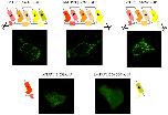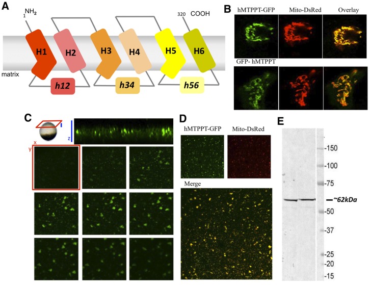 Figure 3. Cellular distribution of hMTPPT-GFP or GFP-hMTPPT in HepG2 cells and X. Oocytes.A) Predicted 6 transmembrane domains of hMTPPT showing the location of three-fold tandem repeated domains and both NH2 and COOH-terminals oriented towards the cytosol. B) Lateral (xy) confocal images of hMTPPT-GFP or GFP-hMTPPT co-transfected with DsRed-Mito (mitochondrial marker) and their overlay in HepG2 cells. C) Resolution of hMTPPT-GFP expression in a Xenopus oocyte. Top, axial image (‘xz’, blue) of a cortical band of hMTPPT-GFP expression. Individual lateral (‘xy’, red) images are displayed as image planes taken at successive 1 µm intervals into the oocyte cortex. D) Lateral (xy) confocal images of hMTPPT-GFP co-transfected with DsRed-Mito and their overlay in Xenopus oocyte. E) Western blot was performed on two individual hMTPPT-GFP expressing oocytes and probed with mouse anti-GFP (1∶1000) and goat anti-mouse antibodies (1∶5000).