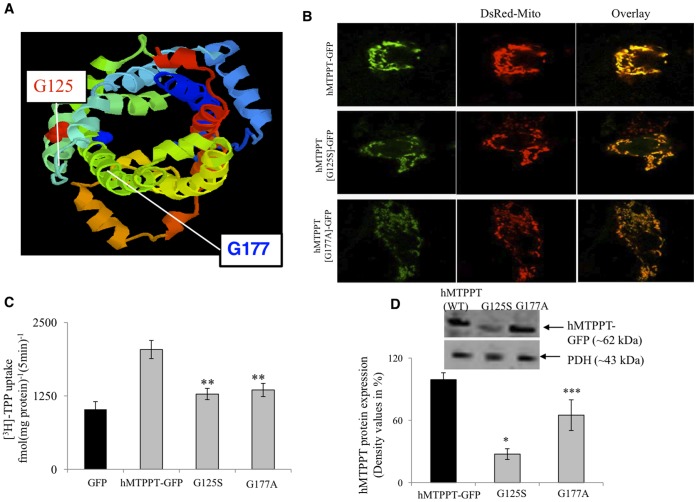 Figure 6. Cellular expression of hMTPPT clinical mutants and their function in stable HepG2 cells.A) The Raswin program which predicts the location of the clinical mutants (G125S and G177A) in the hMTPPT polypeptide. B) Lateral (xy) scan of hMTPPT-GFP (WT) and clinical mutants were co-transfected with DsRed-mito and their overlay in stable HepG2 cell line. C) 3H-TPP (0.38 µM)) uptake by stable HepG2 cells expressing GFP (vector alone), hMTPPT-GFP (WT) and clinical mutants. Initial-rate of 3H-TPP uptake was performed on mitochondria isolated from HepG2 cells. The uptake was linear up to 10 min (data not shown). D) Western blot analyses were performed on isolated mitochondria from hMTPPT (WT) and clinical mutants (60 µg protein) as described in âMethodsâ. Blots were incubated with mouse monoclonal GFP antibodies. Samples were normalized relative to pyruvate dehydrogenase (PDH) protein expression. Data are mean ± SE from at least three different samples from three different batches of cells. * p<0.01,** p<0.02,*** p<0.04.