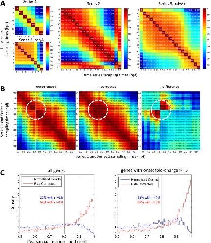 Fig. 2. Consistency and reproducibility in time series data. (A) Pairwise Spearman correlation between all samples for each series; asterisks mark replicates in Series 2 (4.5 and 6.5 hpf). We chose ranked Spearman correlations over Pearson correlations as they reveal better the biological structure in the data. (B) Pairwise Spearman correlation between Series 1 and 2 samples for genes with onset fold change ≥5 validates per gene correction to join time series (see text). Circles mark cross-correlations around join. (C) Histograms of Pearson correlation coefficients between genes in Series 1/2 joined data and Series 3. Left: all genes with median normalised read count >10; right: genes with onset fold change ≥5 in either series. Blue, compared by actual sampling times; red, compared with Series 3 development rate correction. |