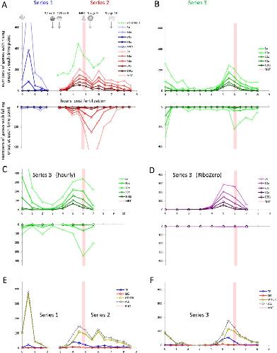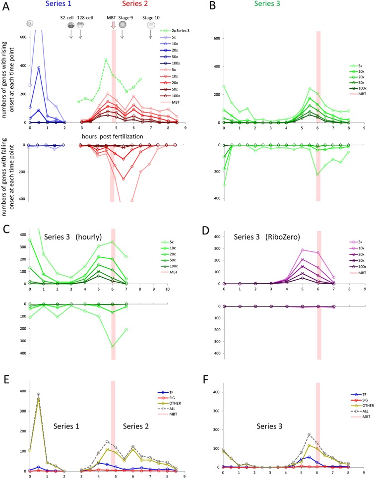 Fig. 5. Gene activity profiles showing successive waves. Each plot shows the number of genes with onset times at each sampling point in the various time series, showing the data for different fold change thresholds (see text). Positive vertical axes represent onset of rising transcript levels, negative axes represent onset of falling levels. All data are plotted against actual sample times, except the 2× Series 3 in A, which is corrected for development rate (Materials and Methods). MBT (pink bar) gives consistent developmental time scale. (A) PolyA+ Series 1 and 2. Also shown is time-adjusted Series 3 data using a more sensitive end-of-series 2× threshold (Materials and Methods) to show detection of the third wave in this developmentally shorter time series. (B) PolyA+ Series 3. (C) PolyA+ Series 3 analysed at one-hour intervals. (D) Ribo-Zero Series 3. (E,F) Activity profiles using 10× threshold, organised by gene type: TF, transcription factor; SIG, signalling molecules and receptors; other, genes not classified as TF or SIG. Stage diagrams reproduced from Nieuwkoop and Faber (Nieuwkoop and Faber, 1994) with permission of Garland Science/Taylor & Francis, LLC. |