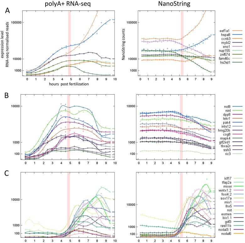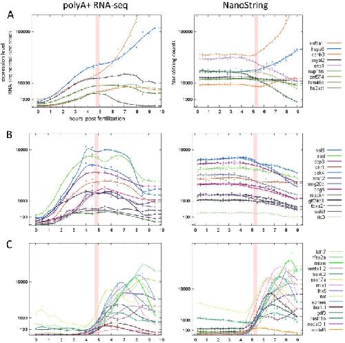 Fig. 7. Comparison of polyA+ and total mRNA expression profiles confirming underlying mechanisms. Although the polyA+ mRNA and NanoString total RNA data are taken from different clutches, the two data sets are entirely consistent. (A,B) Higher and lower expression level genes with onset times before 3.0 hpf showing polyadenylation of maternal mRNAs. (C) Genes with onset times after 3.0 hpf showing zygotic transcription. |