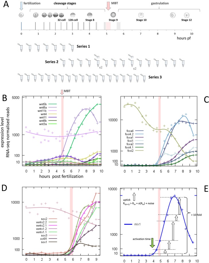 Fig. 1. High-resolution transcriptional profiling in early Xenopus tropicalis development. (A) Embryos were sampled in groups of 50 (Series 1 and 2) or ten (Series 3) at 30-min intervals between fertilisation and early gastrulation and used to generates RNA-seq libraries for Illumina sequencing. Series 3 is scaled to the development rate of Series 1 and 2 (see text). (B-D) Expression profiles constructed from time series data. Gene families (Series 1/2): (B) Wnt; (C) Foxa and Foxi. (D) Pluripotency factors (Series 3) shown to amplify MBT in zebrafish (Lee et al., 2013). (E) Gene onset detection requires a run of successive data points, each exceeding the one before by more than is likely to have occurred by chance (see Materials and methods). Stage diagrams reproduced from Nieuwkoop and Faber (Nieuwkoop and Faber, 1994) with permission of Garland Science/Taylor & Francis, LLC. |