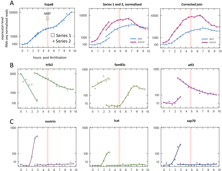 Fig. 3. Expression profiles showing variability in normalised maternal mRNA levels. Study of overlapping data points between Series 1 (squares) and Series 2 (crosses). (A) Almost clean joins (left) and small offsets between series (middle) corrected with a per gene adjustment (right) (see text). (B,C) Highly divergent expression profiles suggest real variability in underlying populations of maternal mRNAs between clutches (from different mothers). |
