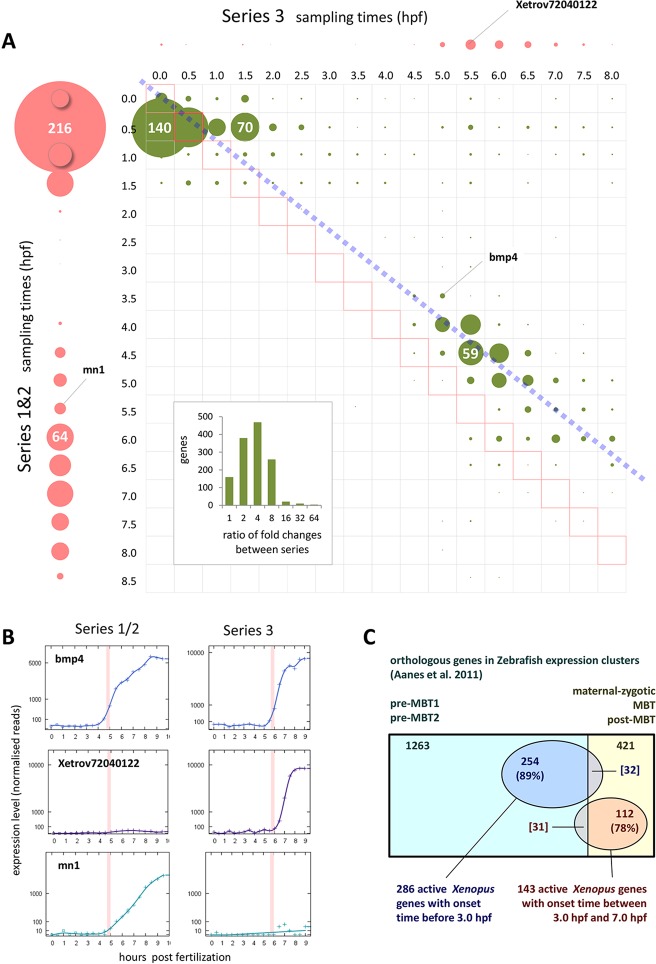 Fig. 4. Reproducibility and conservation in time series data. (A) Reproducibility of onset times between Series 1&2 and Series 3. Genes with an onset time and at least a tenfold change in one or both series plotted in circles of size proportional to the numbers of genes (figures shown in white for scale). Single gene circles are not plotted. Green circles represent genes with onset fold change of at least 2× in the other time series, allowing for significant difference in fold change (see text). Genes in circles adjacent to dashed blue line (developmental time equivalence between Series 1&2 and Series 3; see Materials and methods) are considered to have reproducible onsets. Pink circles represent genes having detectable onset in only Series 1&2 (vertical axis) or Series 3 (horizontal axis). Inset: numbers of genes with onsets in both series at different ratios of fold change. (B) Examples of genes (marked in A) showing: reproducible onset times (Bmp4); no detectable onset in Series 1&2 (Xetrov72040122); and no detectable onset in Series 3 (Mn1). (C) Conservation shown in overlap between Xenopus and zebrafish genes associated with either polyadenylation or transcription. Numbers show frog-fish orthologues; genes in zebrafish expression profile clusters (Aanes et al., 2011) shown in rectangles, and X. tropicalis genes with onset times indicating polyadenylation or transcription (fold change threshold ≥5) shown in ovals. |