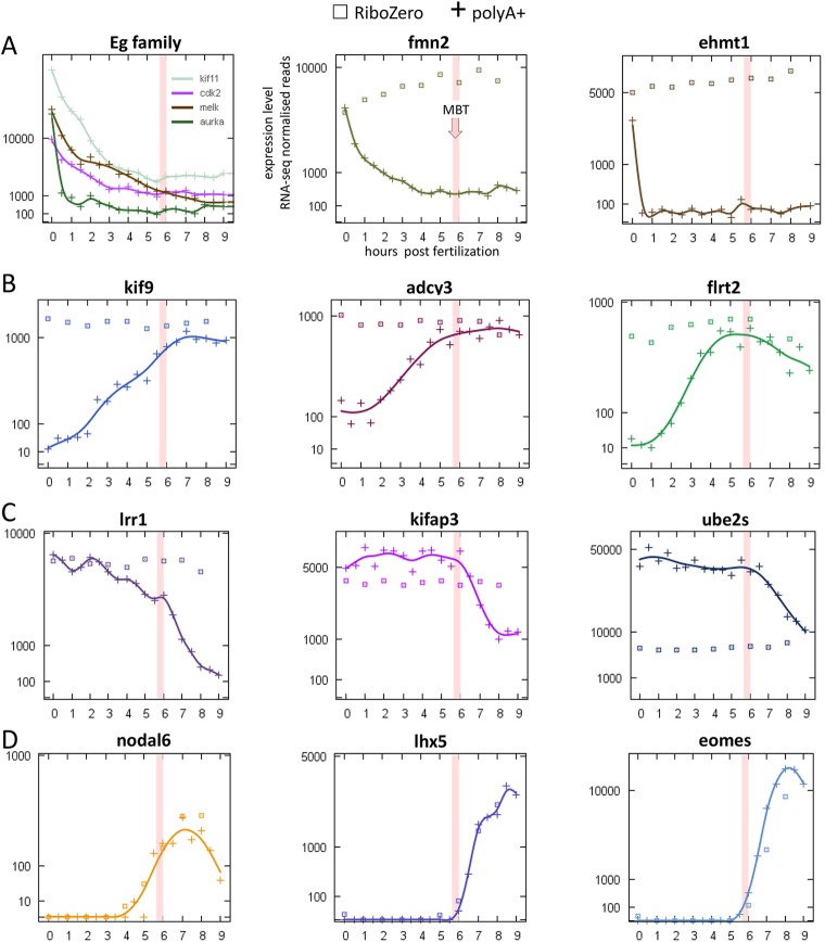 Fig. 6. Expression profiles of split sample polyA+/Ribo-Zero RNA-seq data illustrating mechanisms underlying changes in polyA+ transcript levels. Data from Series 3: squares, Ribo-Zero; crosses, polyA+. (A) Eg family of genes: controls for detection of post-fertilisation deadenylation of maternal mRNAs; and other deadenylated genes. (B) Post-fertilisation polyadenylation of maternal mRNAs. (C) Deadenylation of maternal mRNAs at MBT. (D) Transcriptional activation of genes with onset time in the second wave. |