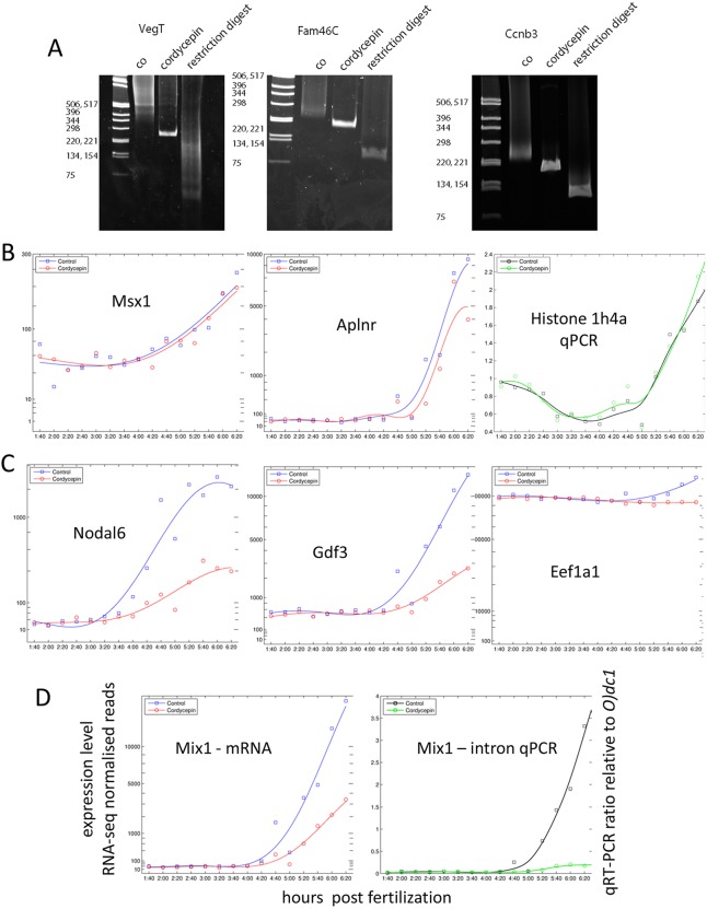 Fig. 8. Variable transcriptional deficit at MBT in embryos treated with cordycepin. (A) Confirmation of inhibition of polyadenylation: shortened polyA+ tail lengths in cordycepin-treated embryos for the polyadenylated maternal genes VegT, Fam46c and Ccnb3. Lanes: âcoâ, long and variable polyA+ tail in controls; âcordycepinâ, consistently short polyA+ tail in treated embryos; ârestriction digestâ, confirmatory restriction digest of a gene-specific PCR fragment (Materials and Methods). (B-D) Transcriptional activation of genes in cordycepin-treated versus control embryos by NanoString nCounter (red/blue) or qPCR (green/black). (B) Transcription unaffected by cordycepin treatment. (C) Substantially reduced transcription levels after cordycepin treatment. (D) Loss of primary transcripts for Mix1 shown by intron qPCR confirms loss of transcription, not degradation of deadenylated transcripts. |
