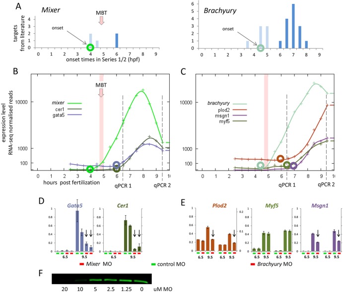 Fig. 9. Targets of MBT-activated transcription factors are found activated within 1-2 h in the third wave. (A) Onset times from Series 2 data for published targets of transcription factors Mixer (Loose and Patient, 2004; Sinner et al., 2006) and Brachyury (Gentsch et al., 2013). Numbers of targets shown at each time point: light blue, onset in second wave; dark blue, onset in third wave or beyond. Onset time of transcription factor is indicated by circle on time axis. (B,C) Expression profiles of Mixer and Brachyury, and published targets selected for qPCR. Circled data points show onset times, dashed lines indicate qPCR sample points. (D,E) qPCR data relative to Odc1 for selected targets at 6.5 hpf and 9.5 hpf, comparing expression in transcription factor morpholino (MO)-injected versus control MO-injected embryos. Arrows show reduced expression in transcription factor knockdown. Data are two technical replicates from pairs of biological replicates: Mixer biological replicates are from a single clutch, Brachyury biological replicates are from different clutches. (F) Inhibition of in vitro translation of Mixer by Mixer MO showing the threshold concentration of morpholino able to block the translation of HA-tagged Mixer. |