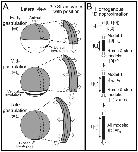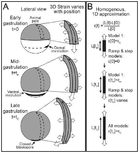 Figure 5. Model schematic.(A) Diagrams of blastopore closure from the lateral side. The ectoderm and neurectoderm (gray) spreads over the embryo during gastrulation. Involution begins on the dorsal side at t = 0, and begins on the ventral side at tP; the blastopore closes at tC. In the generalized model (Model 1) we assumed all morphogenetic durations (tP, tC, etc) changed by the same proportion with temperature. In the step and ramp models (Models 2A & B) tP is used, as an estimate of the timing of cell behaviors that exert morphogenetic forces, to predict tC. A strip of tissue (A, to right of each whole embryo schematic) experiences spatially and temporally varying stresses (open arrows; stresses from deep tissues not shown), which elongate it and change its shape. We approximate this deformation as uniform stretching of a strip of material (B). The generalized model (Model 1) assumes temperature only affects the speed of morphogenesis, therefore each morphogenetic event occurs at fixed, but unspecified strains (εP,εC,…). In the step and ramp models (Models 2A & B) the main forces driving blastopore closure begin near the start of ventral involution (so ε[0]≈0), and blastopore closure occurs at a fixed strain (ε[tC] = εC); however, the strain at tP varies with temperature. |