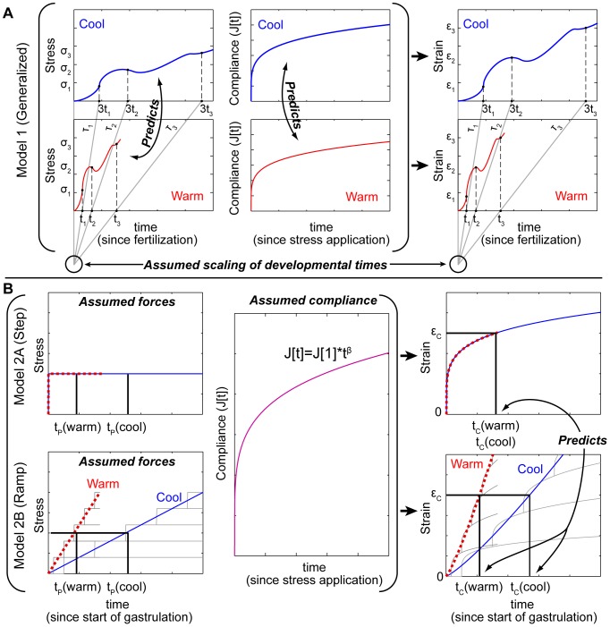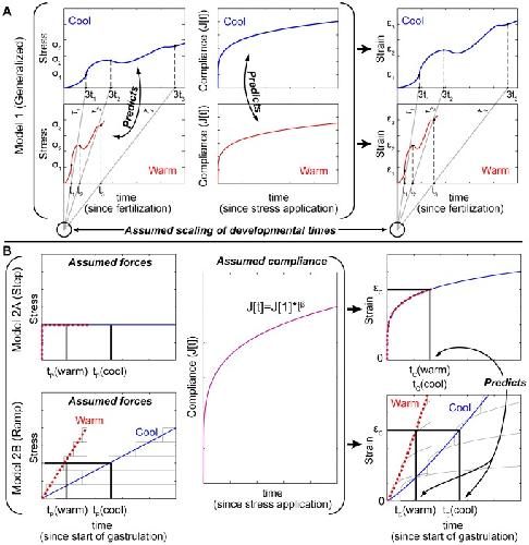 Figure 6. Differences among models.Hypothetical stress (left), creep compliance (middle), and deformation (strain, ε; right) in the tissue. (A) The generalized model (Model 1) assumes the relative timing (ô) and the strains, of all events (1, 2, 3,…) are independent of temperature (cool (blue) vs warm (red)), as in a movie played faster. The generalized model does not specify the developmental course of strain or stress, only that timing scales with temperature. The generalized model predicts how stress and compliance vary together as temperature changes (Model 1, eqn.16). (B) Step and ramp models (Models 2A & 2B). The step and ramp models assume morphogenetic stresses are stepped (top) or ramped (bottom) with time. For a step stress (upper), the change in tP with temperature does not affect the time tC to reach strain εC (when the blastopore closes) because peak stress and compliance are unchanged (Model 2A, eqns. 21–22). A ramp is the sum of stress increments (gray lines; bottom left). Stress timing (hence the slope of the ramp) scales with tP, and therefore with temperature (red, warm; blue, cool). The time tC varies with tP (and therefore temperature) for the ramp model (upper; Model 2B, eqns. 25–26), because strain increments follow the change in timing of stress increments (gray lines). |