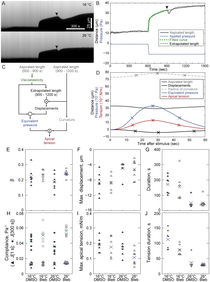 Figure 1. Temperature dependence of compliance and strength of induced contraction.(A) Representative kymographs of microaspiration with electrically induced contractions at 900 seconds at 16°C (upper) and 26°C (lower). (B) Fit of power law viscoelastic model to the aspirated length from 600 to 900 s for the 26°C case. (C) Flow chart for analysis of contractions. (D) Contraction analysis. âX's indicate half-max, max, and return to half-max for each curve. Panels B and D show data from the lower embryo in A. Arrowheads in A and B indicate electrical stimuli. (E) β, (F) maximum displacement during induced contraction, (G) duration (half-maximum until return to half-maximum displacement) of contraction, (H) compliance at 1 s (triangles) and at 300 s (circles), (I) maximum apical tension during induced contraction, (J) duration of apical tension. Triangles and circles: individual embryos; X's: means. |